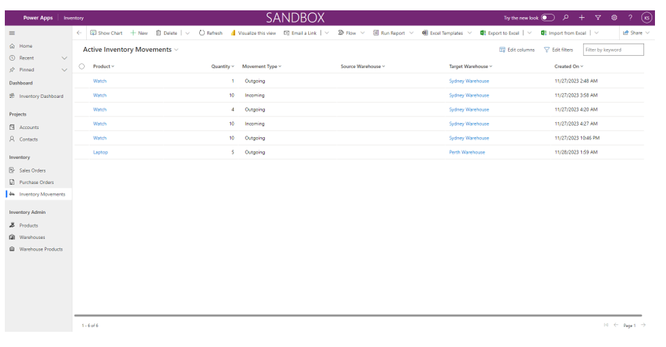 The user can create a new Inventory movement by clicking on the New Button and then adding all the relevant information about the movement such as the Type, Target Warehouse, Product, Quantity, Project etc.