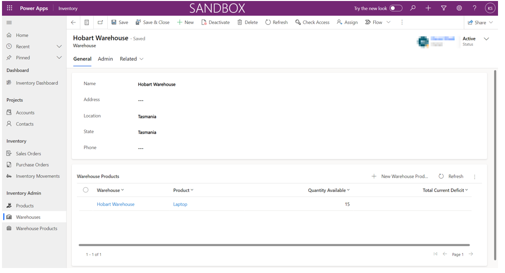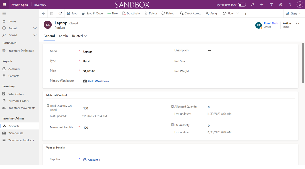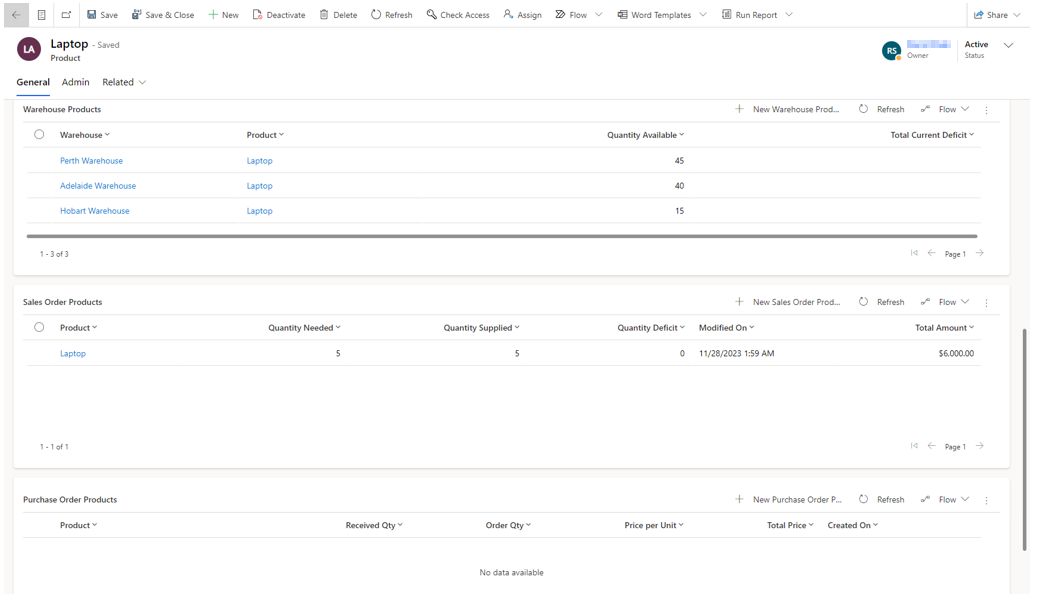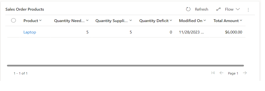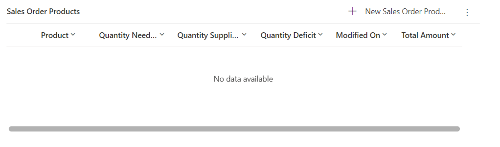 Users will be able to add products to the sales order from the sub grid by clicking on the “+New” sales order product button. The information needed to add products will be Product and Quantity needed. Project name, supplying warehouse and price per unit is auto populated.
