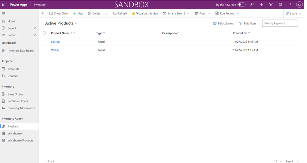When users open the application, Products can be found on the left navigation bar under Inventory admin. There are different views available for Products records. Users can set their default view by selecting the view and clicking on “Set as my default view”. Users can see the important details about the Product in the view itself such as name, type etc.
