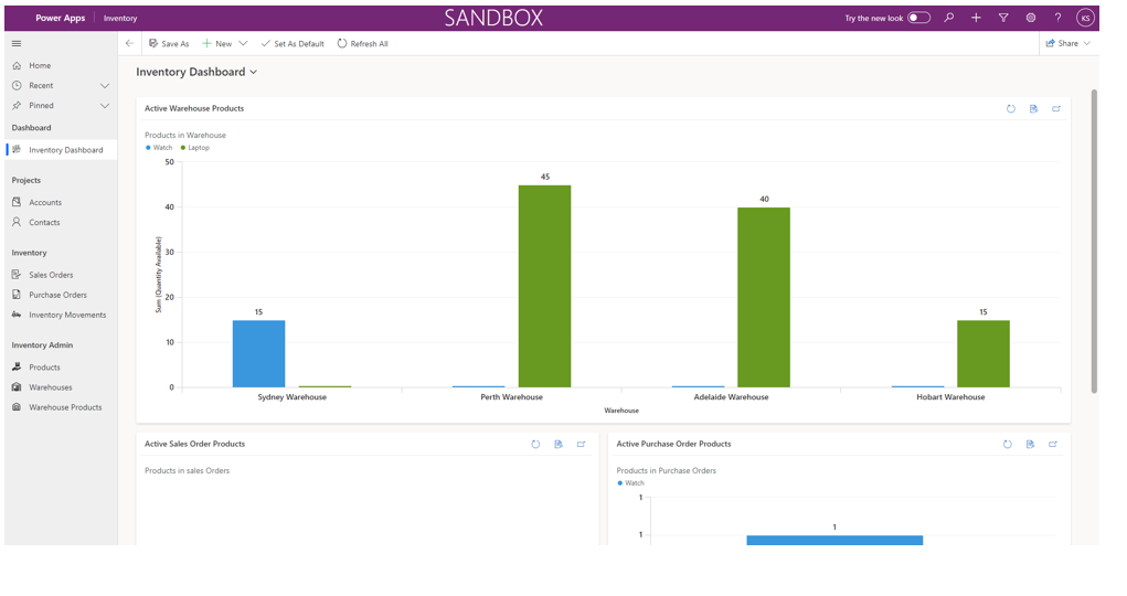 When users open the application, inventory dashboard can be found on the left navigation bar. Users can see all the statistics related to product sales order, purchase order products and warehouses products. All the statistics show active data.
