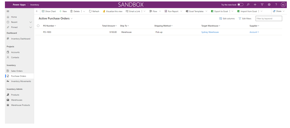 When users open the application, Purchase orders can be found on the left navigation bar. There are different views available for purchase orders. Users can set their default view by selecting the view and clicking on “Set as my default view”. Users can see the important details about the purchase orders in the view itself such as name, po number, target warehouse, status and delivery date etc.