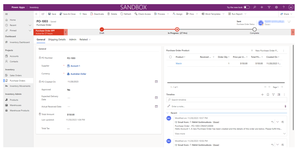 The purchase orders are also a business process and information can be recorded in stages. The status of the purchase orders changes at each stage automatically.