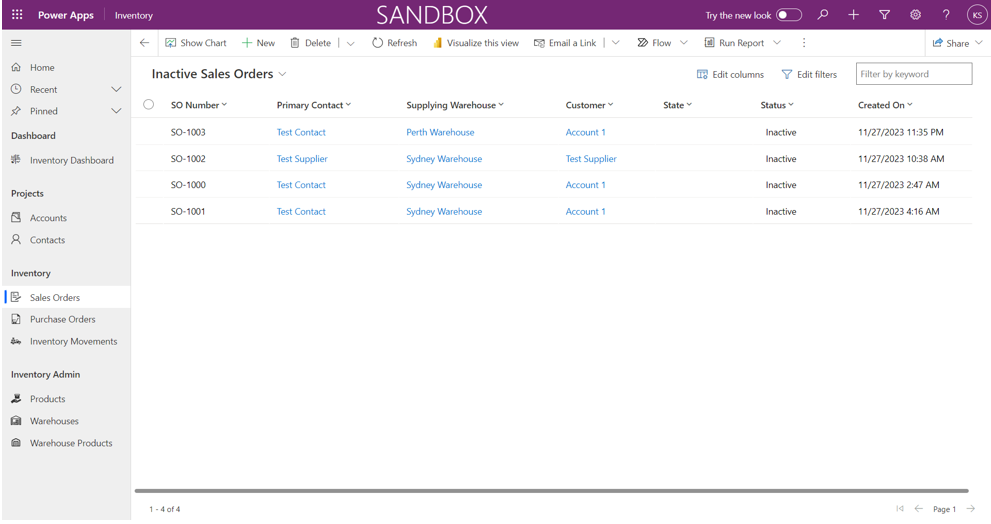 When users open the application, Sales Order can be found on the left navigation bar. There are different views available regarding Sales Orders. Users can set their default view by selecting the view and clicking on “Set as my default view”. Users can see the important details about the sales orders in the view itself such as name, primary contact and supplying warehouse etc.