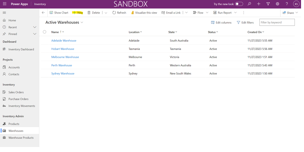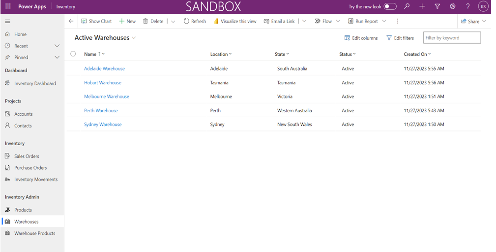 When users open the application, Warehouses can be found on the left navigation bar. Warehouse entity is used to store information regarding different warehouses. There are different views available for Warehouses. Users can set their default view by selecting the view and clicking on “Set as my default view”. Users can see the important details about the warehouse in the view itself such as name, location, state and status etc.